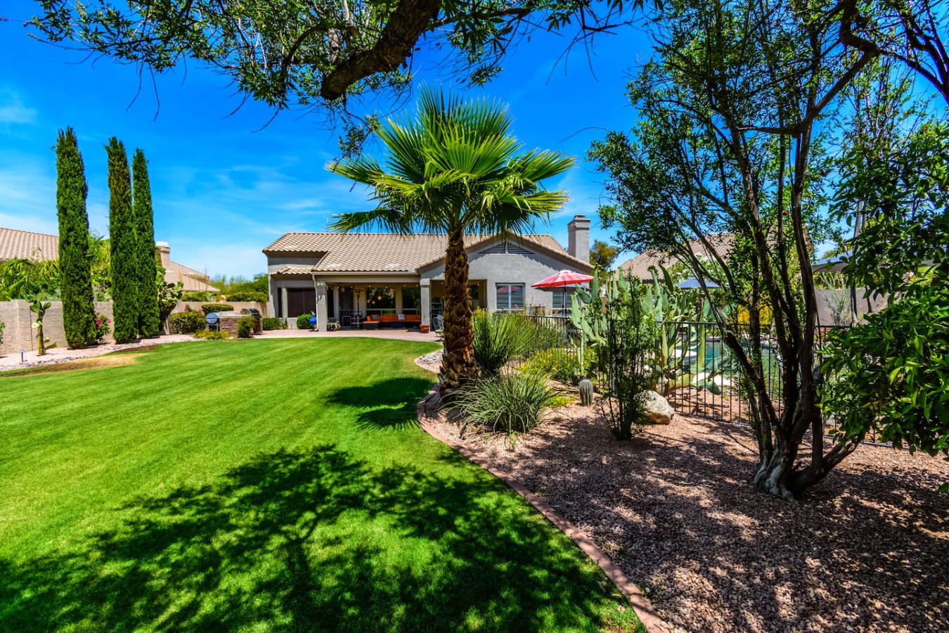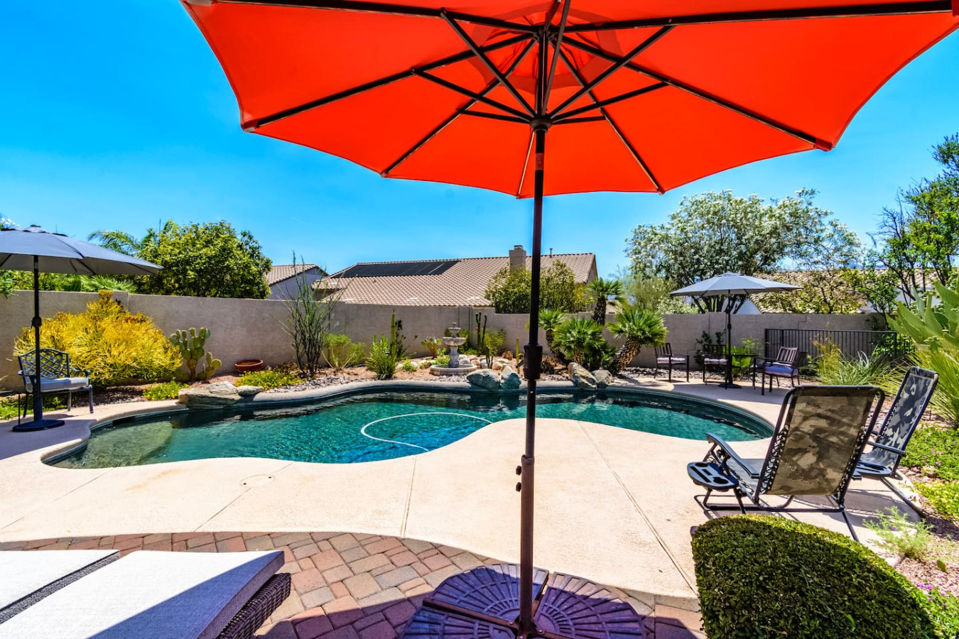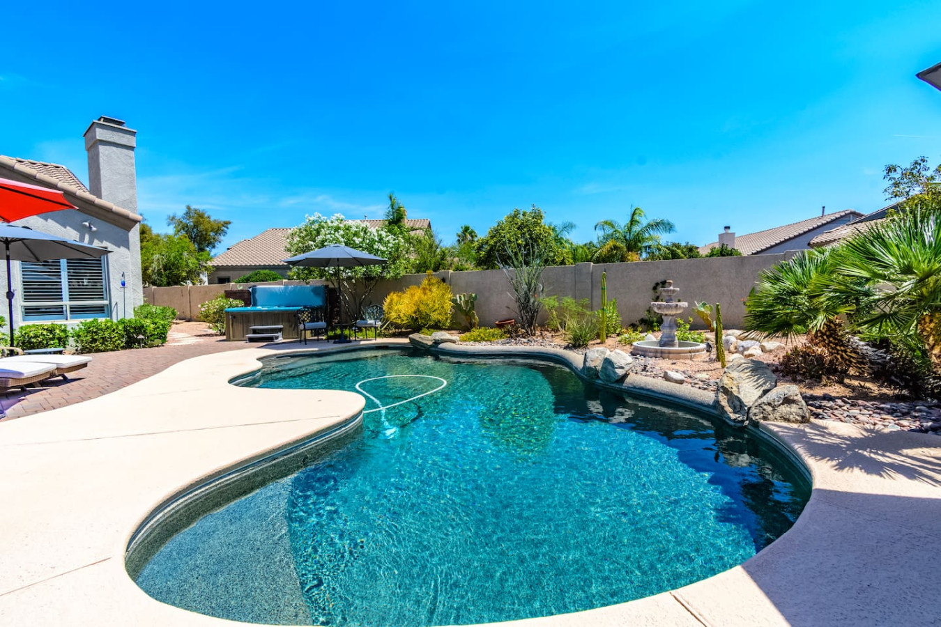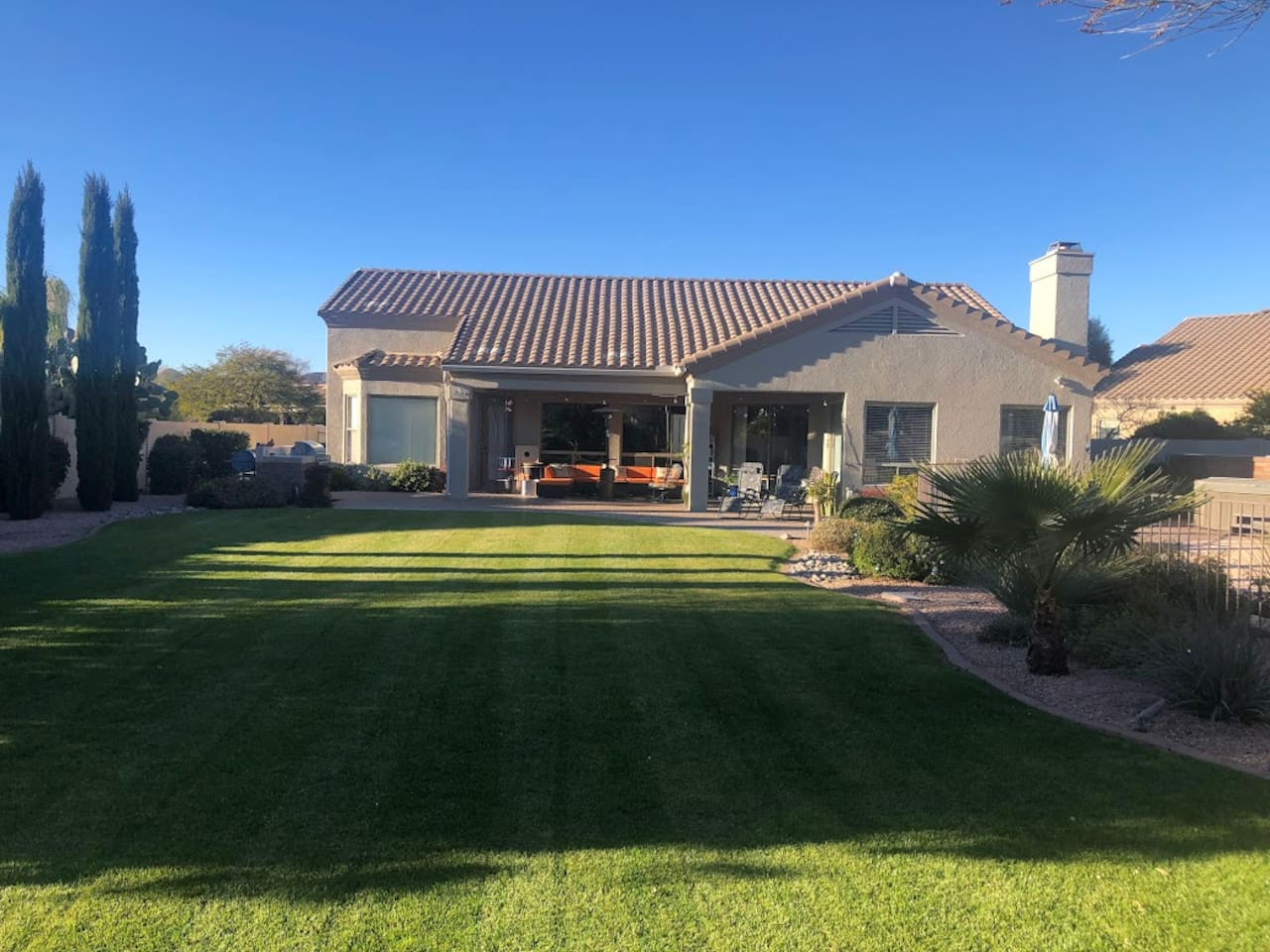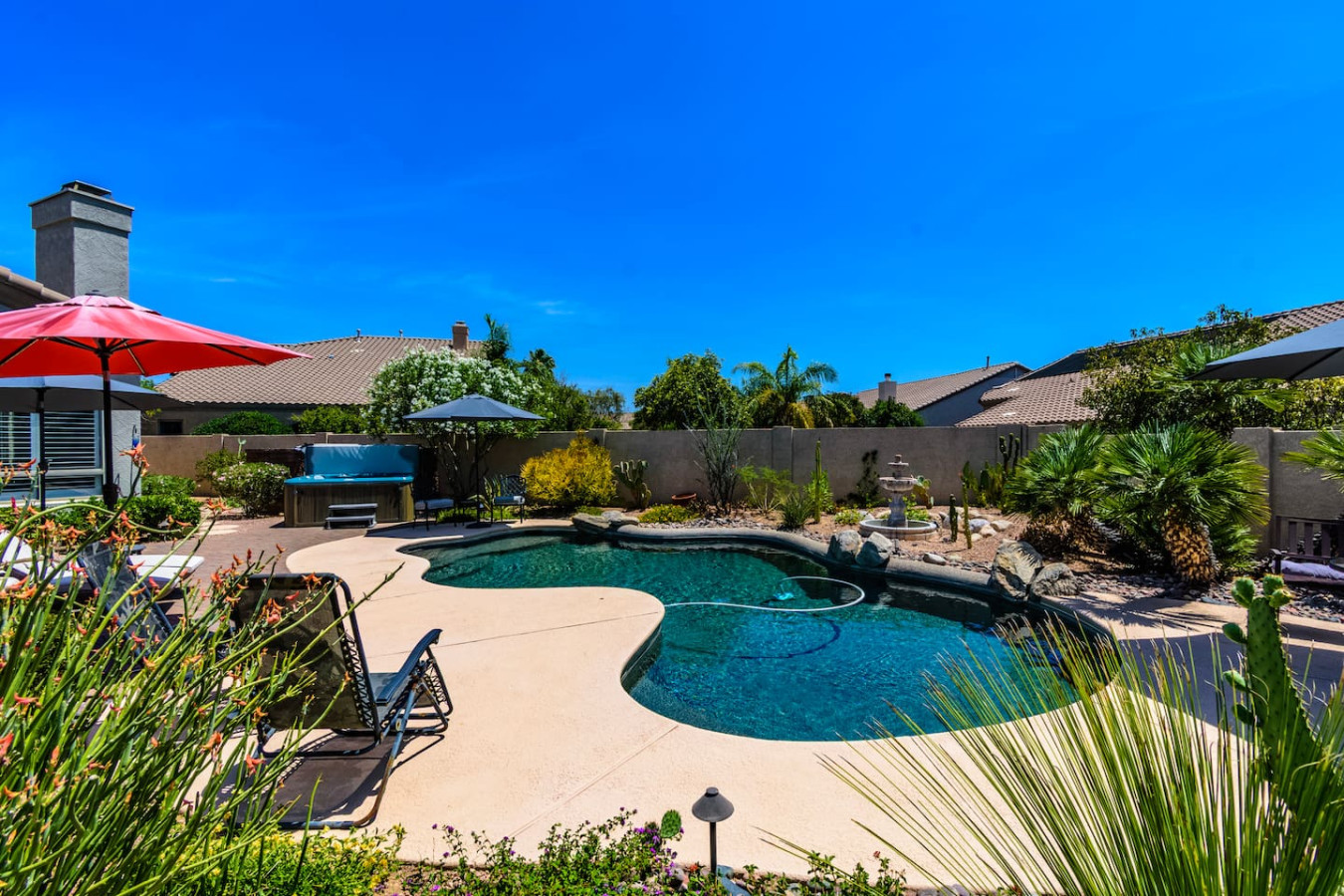 May 2023 5.00This home is a great find. The neighborhood was peaceful and quiet with a playground just minutes away. The kitchen was well equipped and the bedrooms were quite comfortable. As an added bonus to the lush pool and spa in the massive backyard we sampled some fruit from the wonderful citrus trees with our breakfasts. Thank you for creating a wonderful stay.