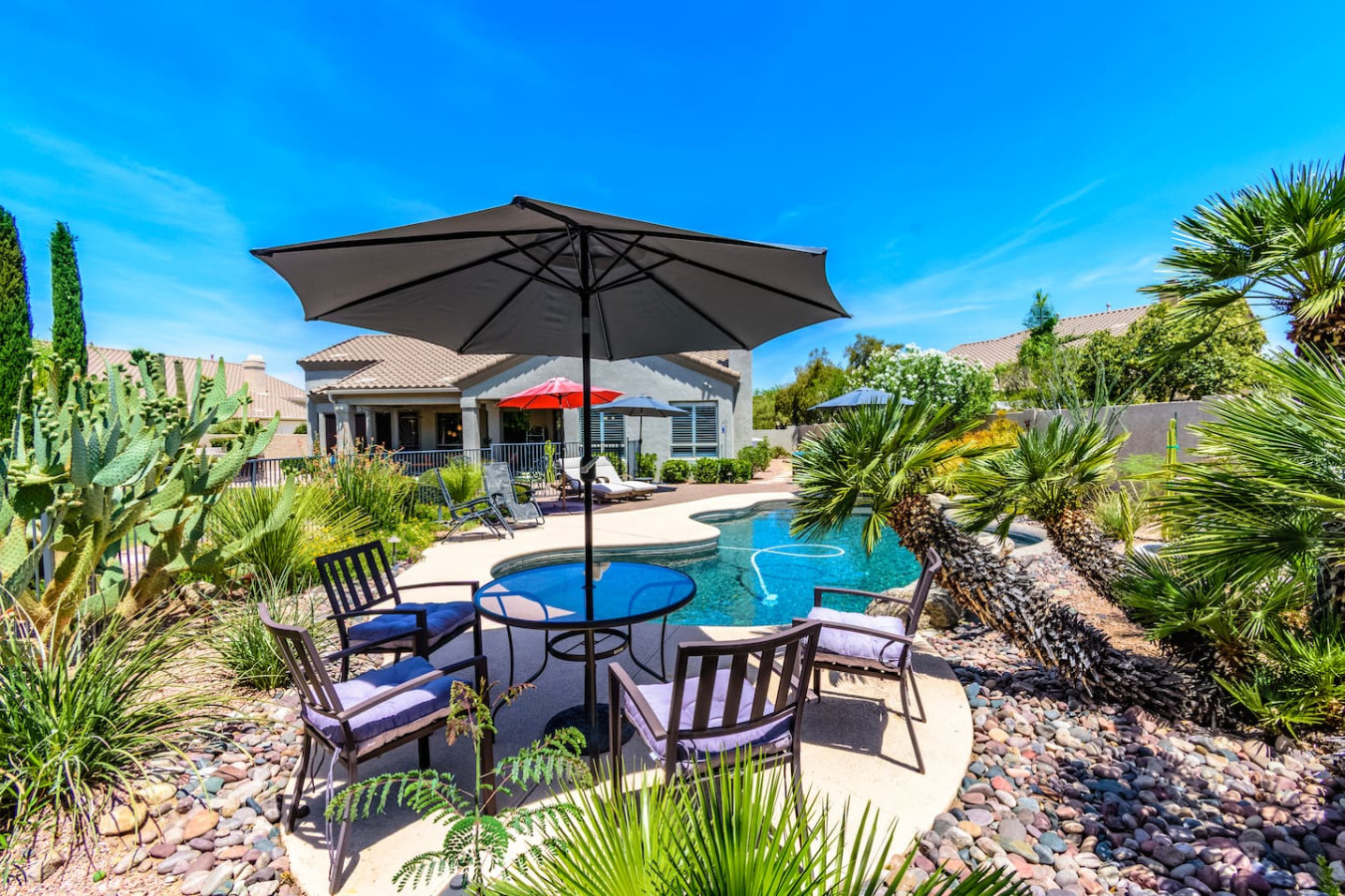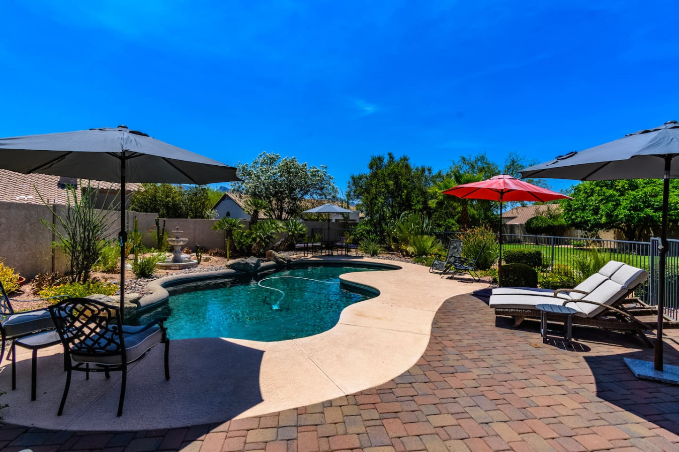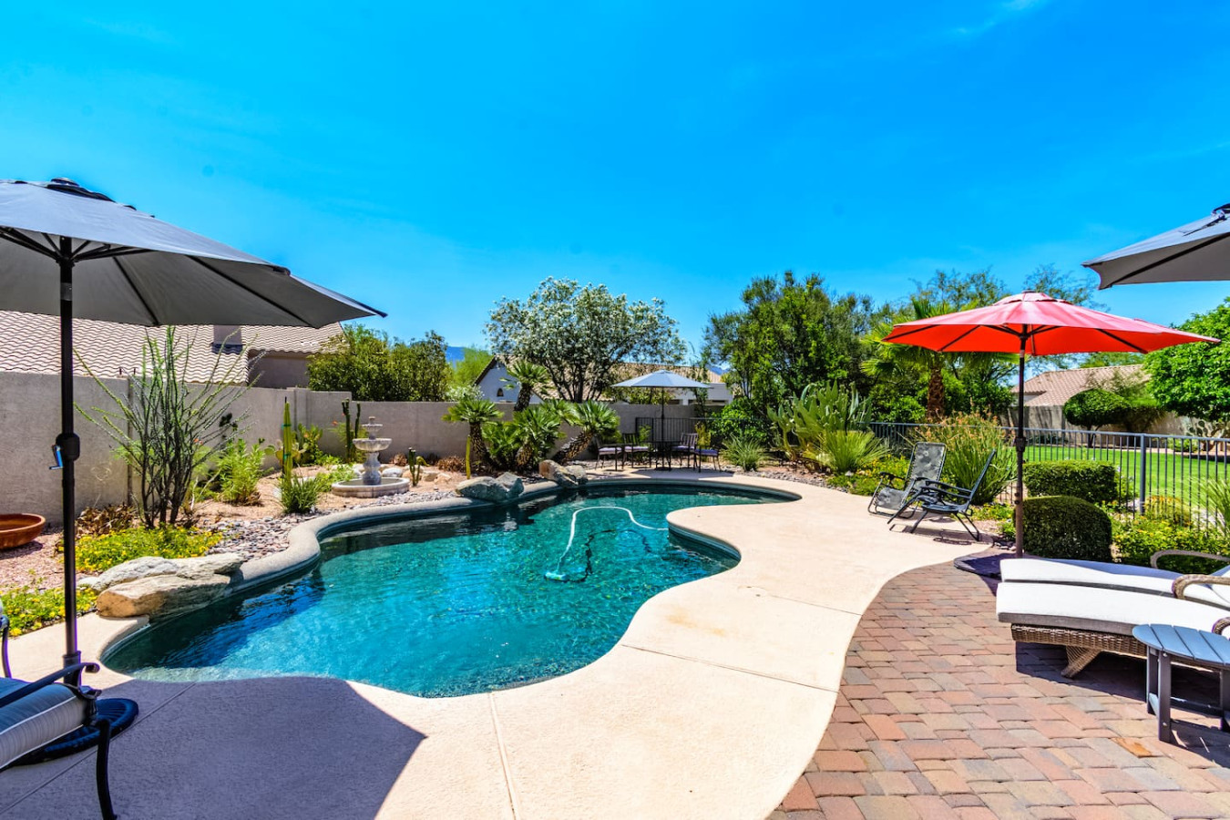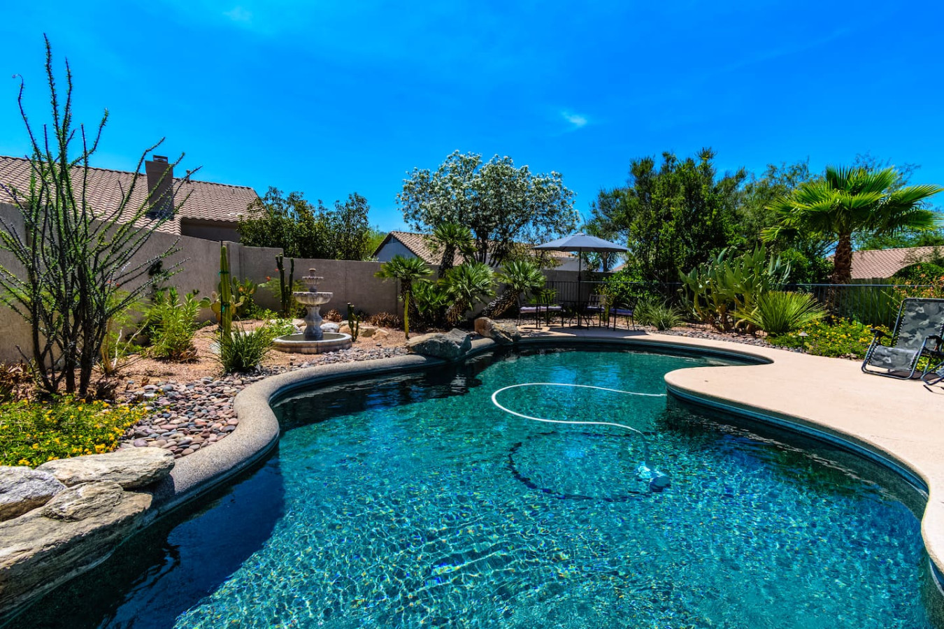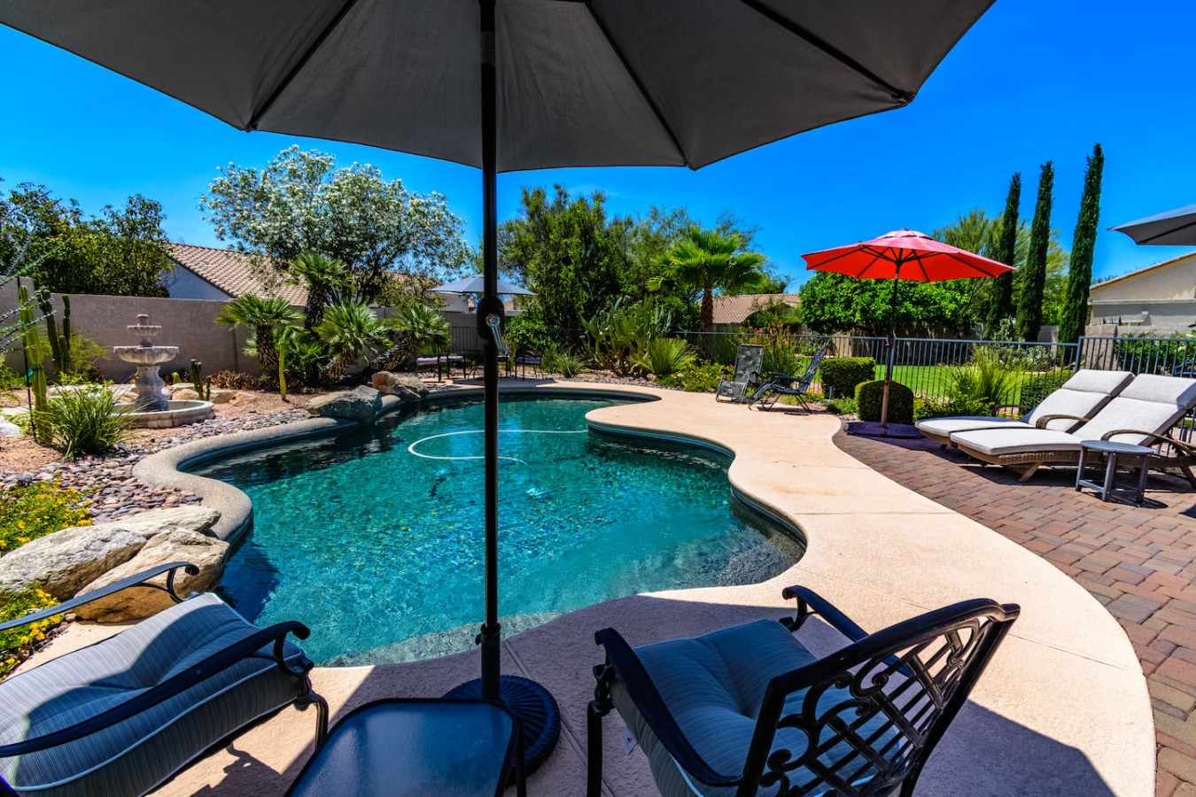 May 2023 5.00This home is a great find. The neighborhood was peaceful and quiet with a playground just minutes away. The kitchen was well equipped and the bedrooms were quite comfortable. As an added bonus to the lush pool and spa in the massive backyard we sampled some fruit from the wonderful citrus trees with our breakfasts. Thank you for creating a wonderful stay.