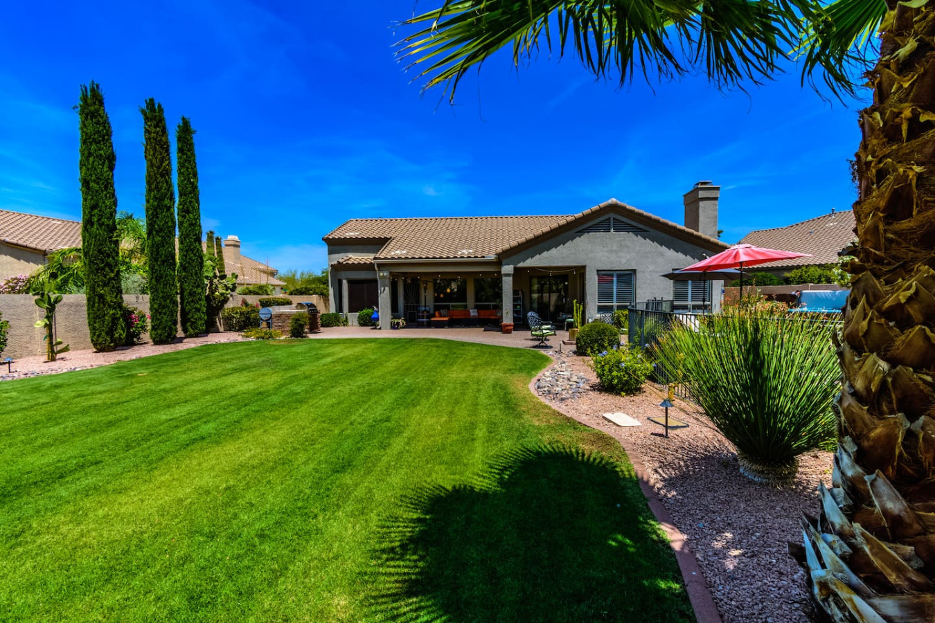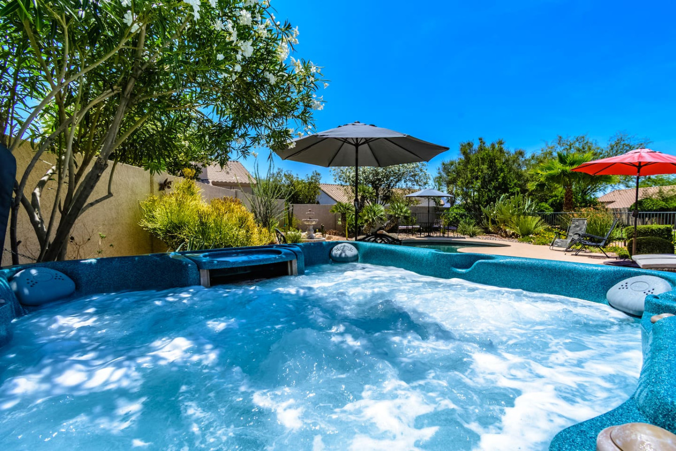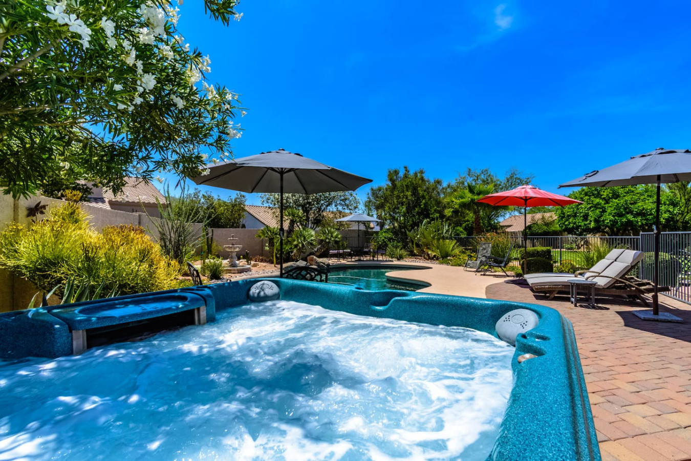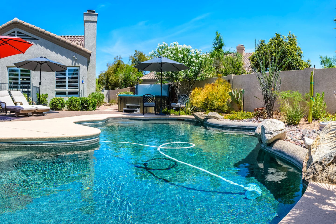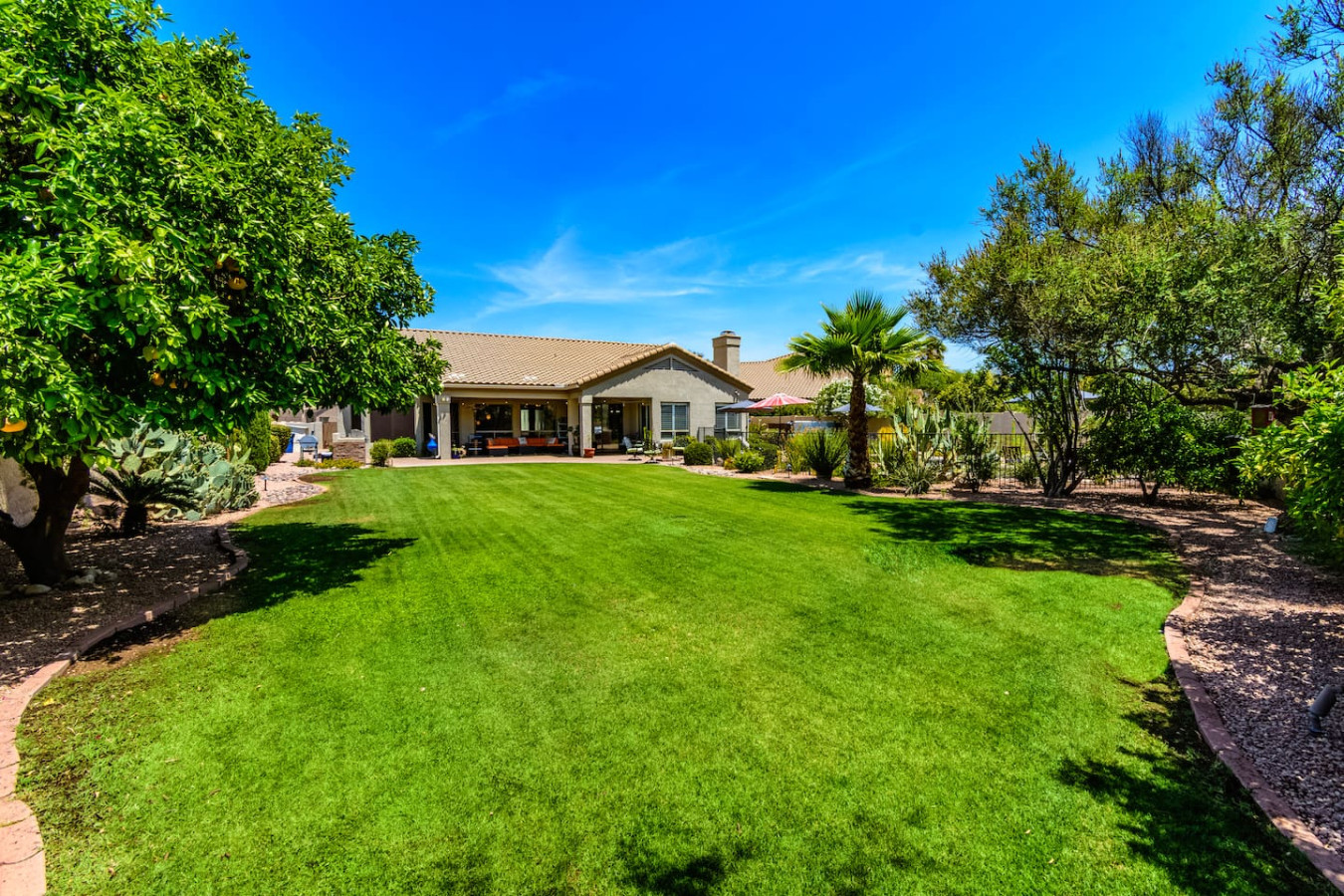 May 2023 5.00This home is a great find. The neighborhood was peaceful and quiet with a playground just minutes away. The kitchen was well equipped and the bedrooms were quite comfortable. As an added bonus to the lush pool and spa in the massive backyard we sampled some fruit from the wonderful citrus trees with our breakfasts. Thank you for creating a wonderful stay.